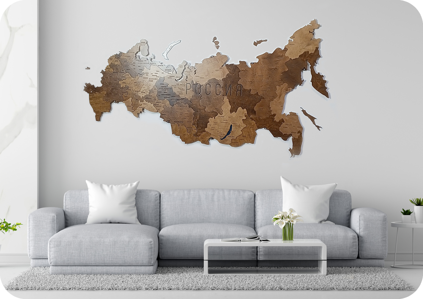 Отзыв с пылу с жару😊Карту повесили буквально сегодня ночью. Весь монтаж - от распаковки до фотографии результата - занял около 3х часов, может, и более. Значит, сначала о плюсах. Карта эффектная, приятная внешне и на ощупь, очень красивый и качественный финишний слой, напоминающий натуральный шпон, стильное сочетание оттенков. Выглядит все это весьма эффектно и презентабельно. Отличная упаковка, все доехало в целости. Есть небольшие недочеты, где-то краска не так легла, где-то лак собрался бугорком, но на стене глазу они не заметны и вид совсем не портят. Теперь недостатки. Наша карта 150см в ширину, а шаблон, по вырезанным контурам которого монтируется карта, 180см. Соответственно, точки не совпадают, и приходится делать "на глаз". Сам шаблон, состоящий из нескольких частей, это отдельная печаль. Слишком много возни с его кусочками, не проще ли прикладывать к картам шаблон - единое полотно? Это очень упростило бы процесс. Великобритании на карте не оказалось, обидно за нее🇬🇧
